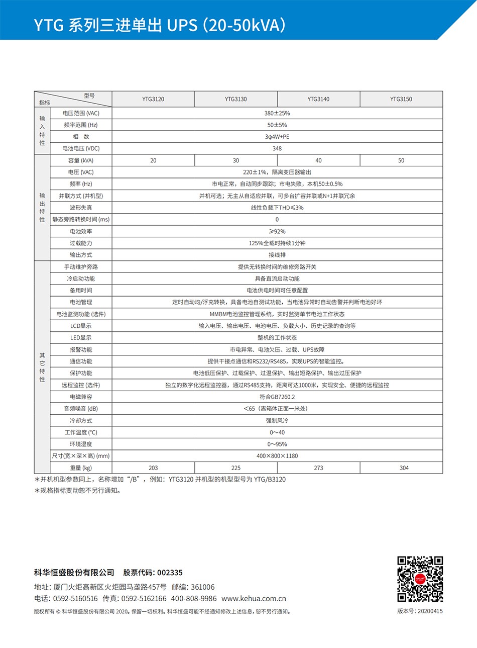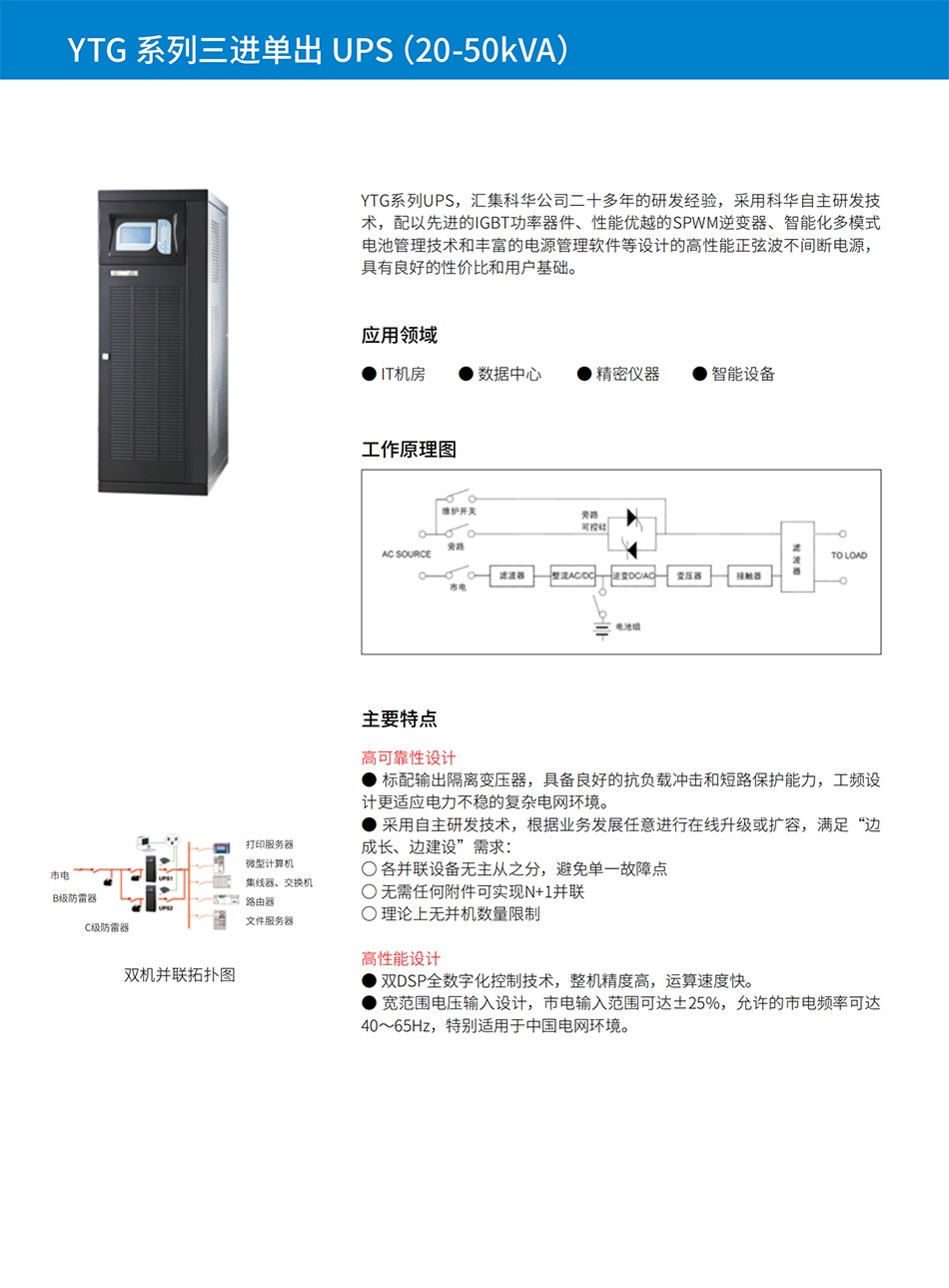 科华YTG系列三进单出UPS(20-50kVA)
